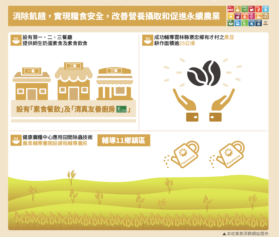 本校健康農糧中心,下設三個服務中心,從種植、生產至食品加工,提供上、中、下游糧食安全把關。