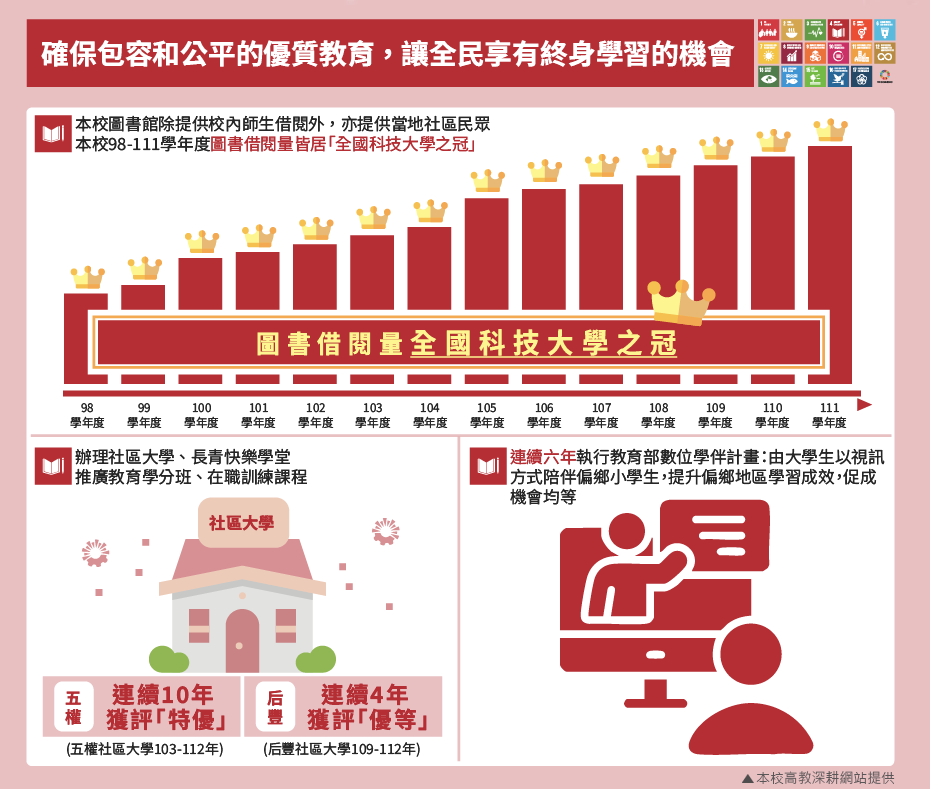 本校校內教育資源免費開放社區民眾共享:波錠紀念圖書館開放校外民眾可免費申辦借閱證、各類講座、各式展演、電影欣賞、SDGs活動及線上磨課師MOOCs課程...等等。