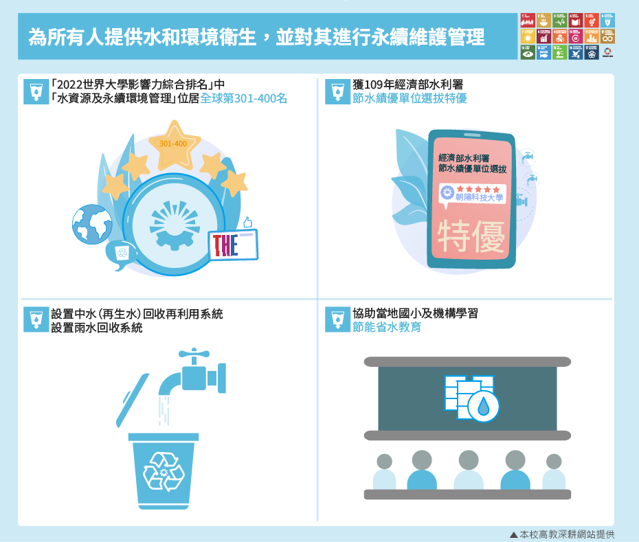 朝陽科技大學創校即建置污水下水道系統,收集校區內餐廳、宿舍浴廁及各大樓廁所所產生之污水,以及化學實驗室的洗滌廢水。日常運作產生的廢(污)水均導入校區污水下水道系統,送至校內廢水處理廠進行處理後,再排放至烏溪流域。 廢水處理廠採用生物處理技術,並因應氣候變遷調適需求,增設MBR薄膜設備,將部分廢水進行高級處理與回收再利用,用於沖廁與澆灌,達到資源循環與節水目標。為為確保處理設施之穩定運作與合規管理,本校進行以下管理工作: