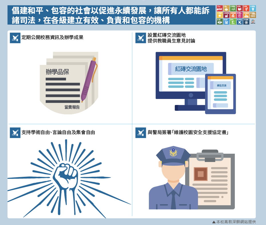 - 與當地警察局簽訂安全支援協定,加強防治毒品與不良幫派入侵校園,消弭校園暴力事件,共同維護校園安全,以協力營造「健康安全,溫馨祥和」之學習環境。